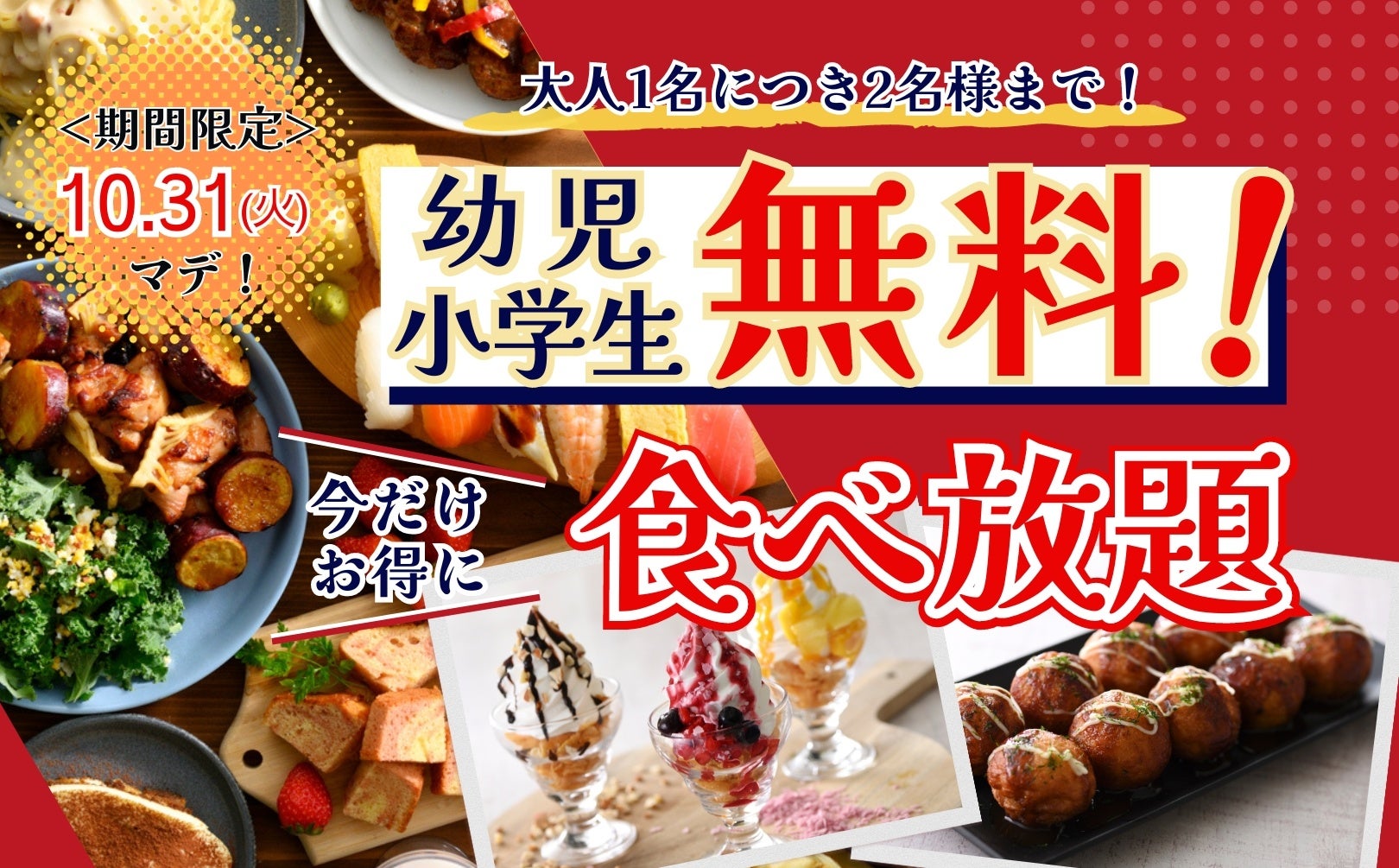 【小学生以下は無料‼更に時間無制限‼】バラエティー豊かな食べ放題『フェスタガーデンららぽーとTOKYO-BAY』では、10/31迄の期間限定にて小学生以下が『無料』で楽しめるお得なキャンペーンを開催!