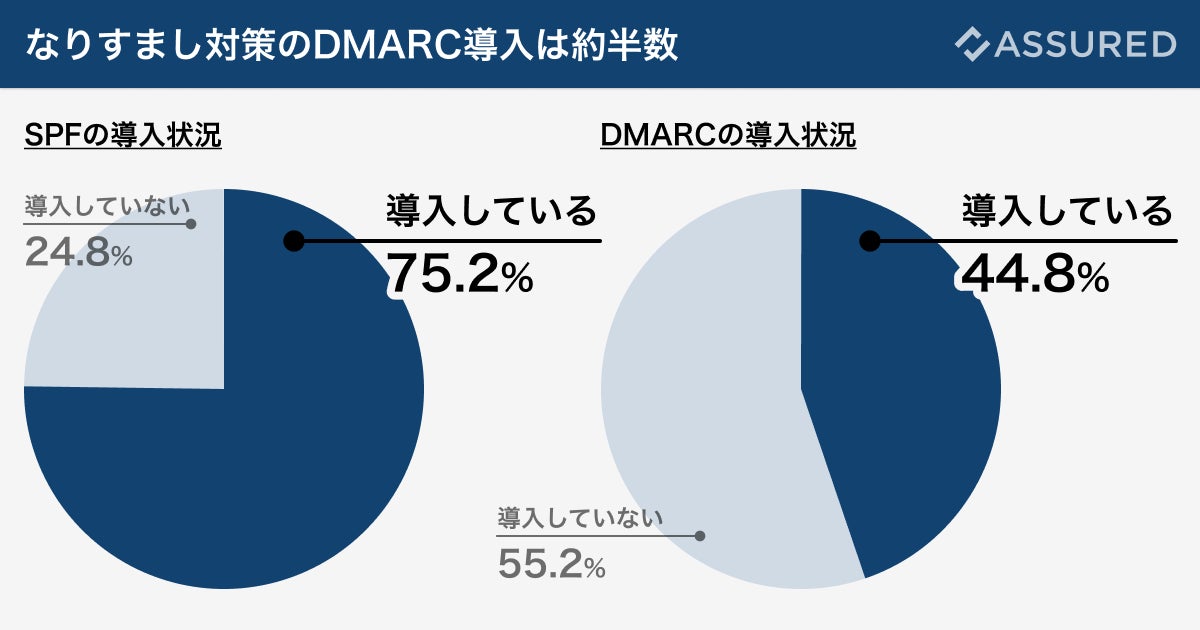 また、SPF等の結果を活用し認証失敗時のポリシーを定める仕組みである「DMARC(Domain-based Message Authentication, Reporting and Conformance)」を導入しているサービスは、より少ない44.8%でした。