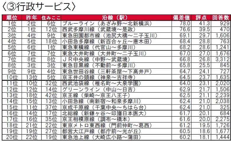●「行政サービス」因子では、昨年から順位の入れ替わりはあるものの、1位のブルーライン(あざみ野~北新横浜)と2位の西武多摩川線(武蔵境~是政)が偏差値70台後半の極めて高い評価を得ています。