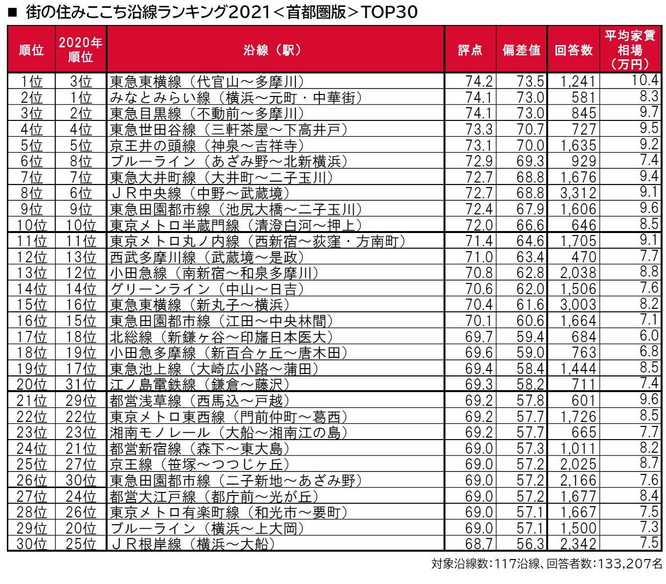 大東建託株式会社(本社:東京都港区、代表取締役社長:小林克満)は、首都圏の117沿線居住の133,207名を対象に、居住満足度調査としては過去にない大規模な本格調査を実施し、今回3回目となる沿線ランキング「いい部屋ネット 街の住みここち沿線ランキング2021<首都圏版>」として集計しました。