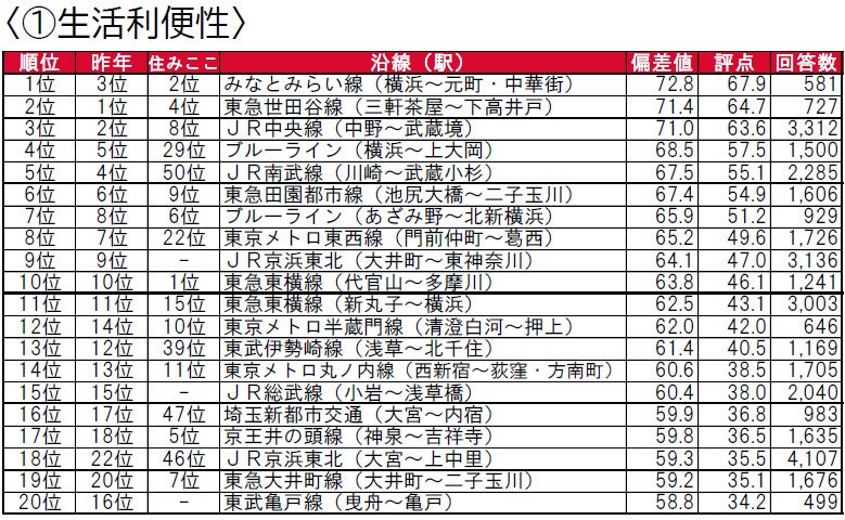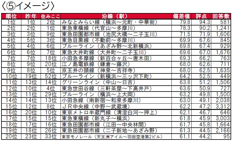1位は昨年3位の東急東横線(代官山~多摩川)、2位は昨年1位のみなとみらい線(横浜~元町・中華街)、3位は昨年2位の東急目黒線(不動前~多摩川)で、TOP3の顔ぶれは同じものの、順位が入れ替わる結果となっています。またTOP10内も順位変動はあるものの顔ぶれに変動はなく、引き続き東急沿線の評価が高く、5路線が入る結果となっています。