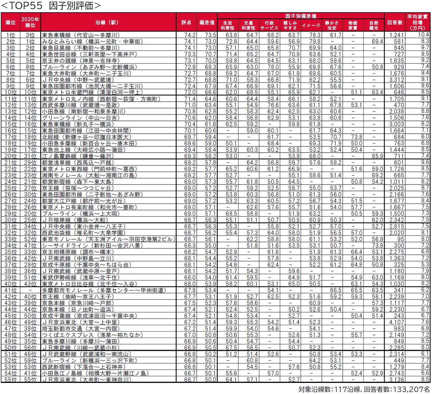 - 街の住みここち沿線ランキング2021<首都圏版> 因子別評価 TOP55