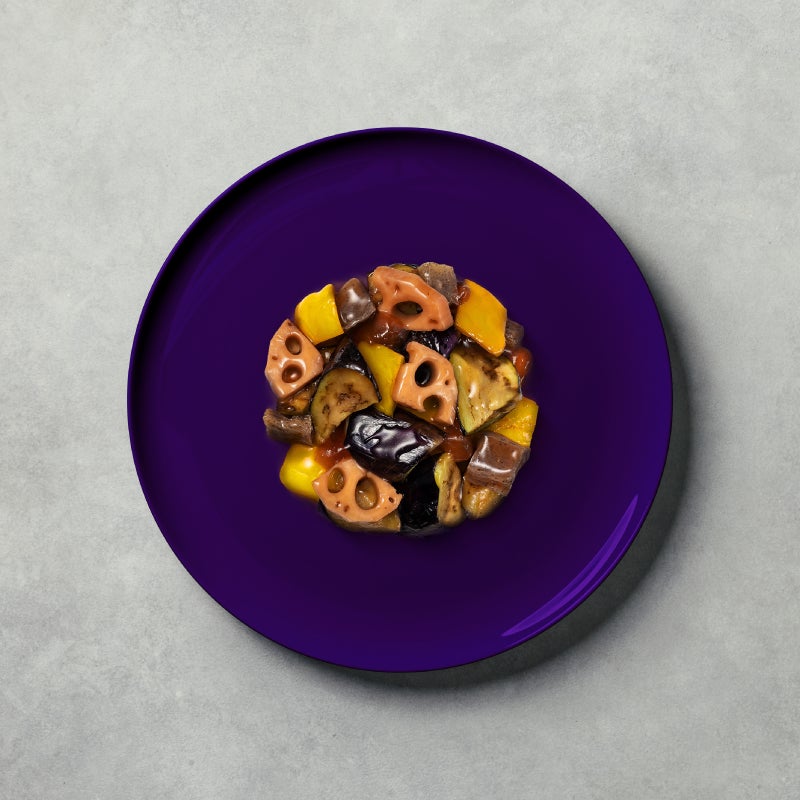 「フルーティーなザクロ酢で仕上げたこんにゃくと4種具材の酢豚風炒め」