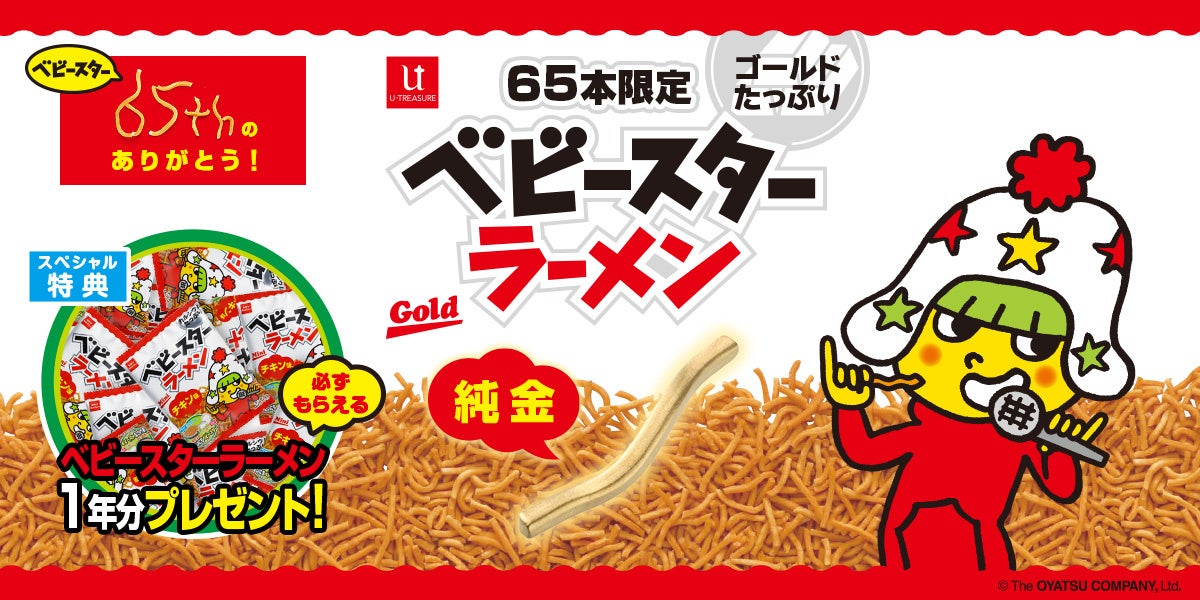 純金製 「ベビースターラーメン」1/1サイズ。65年を記念した限定65本。8月2日(水)より予約開始