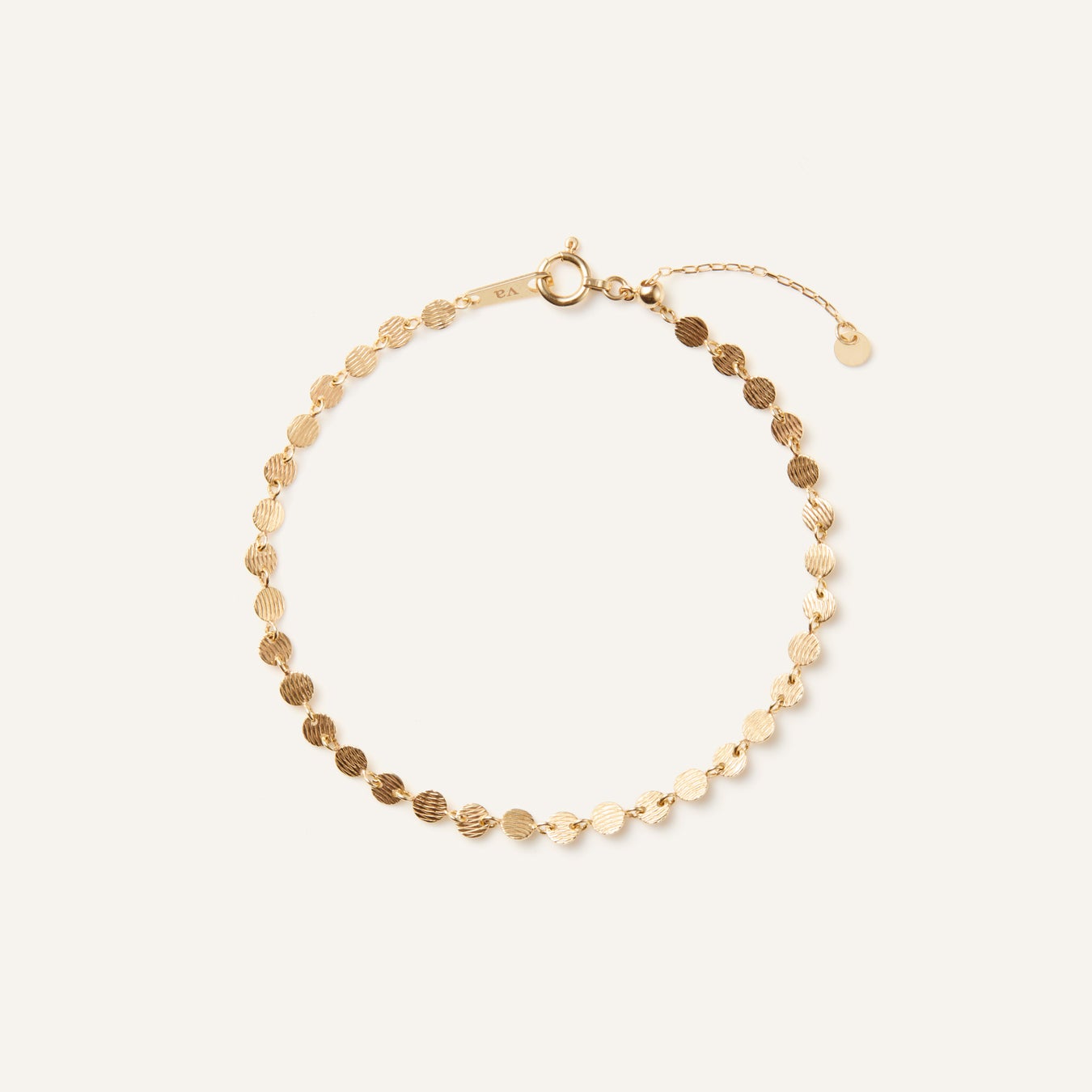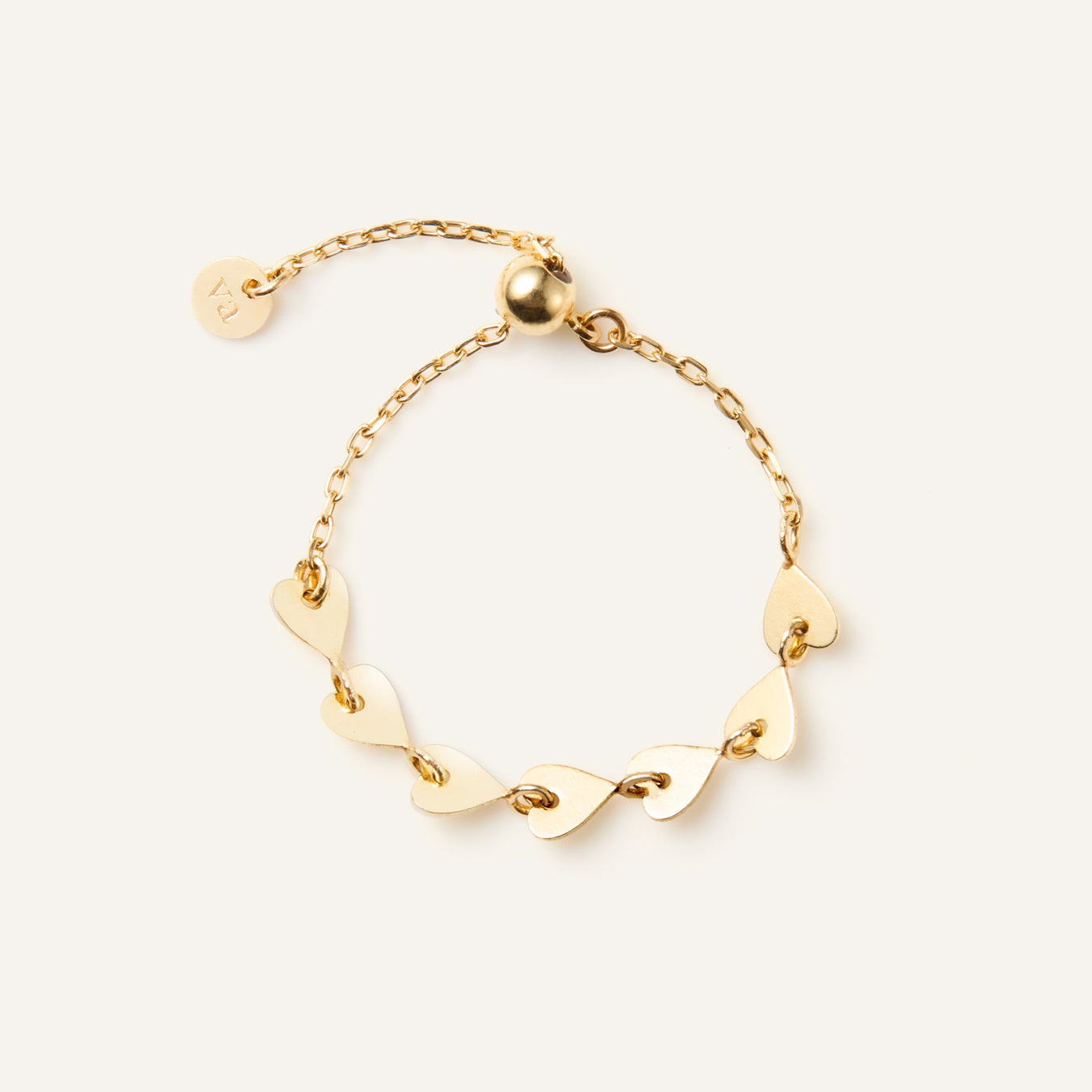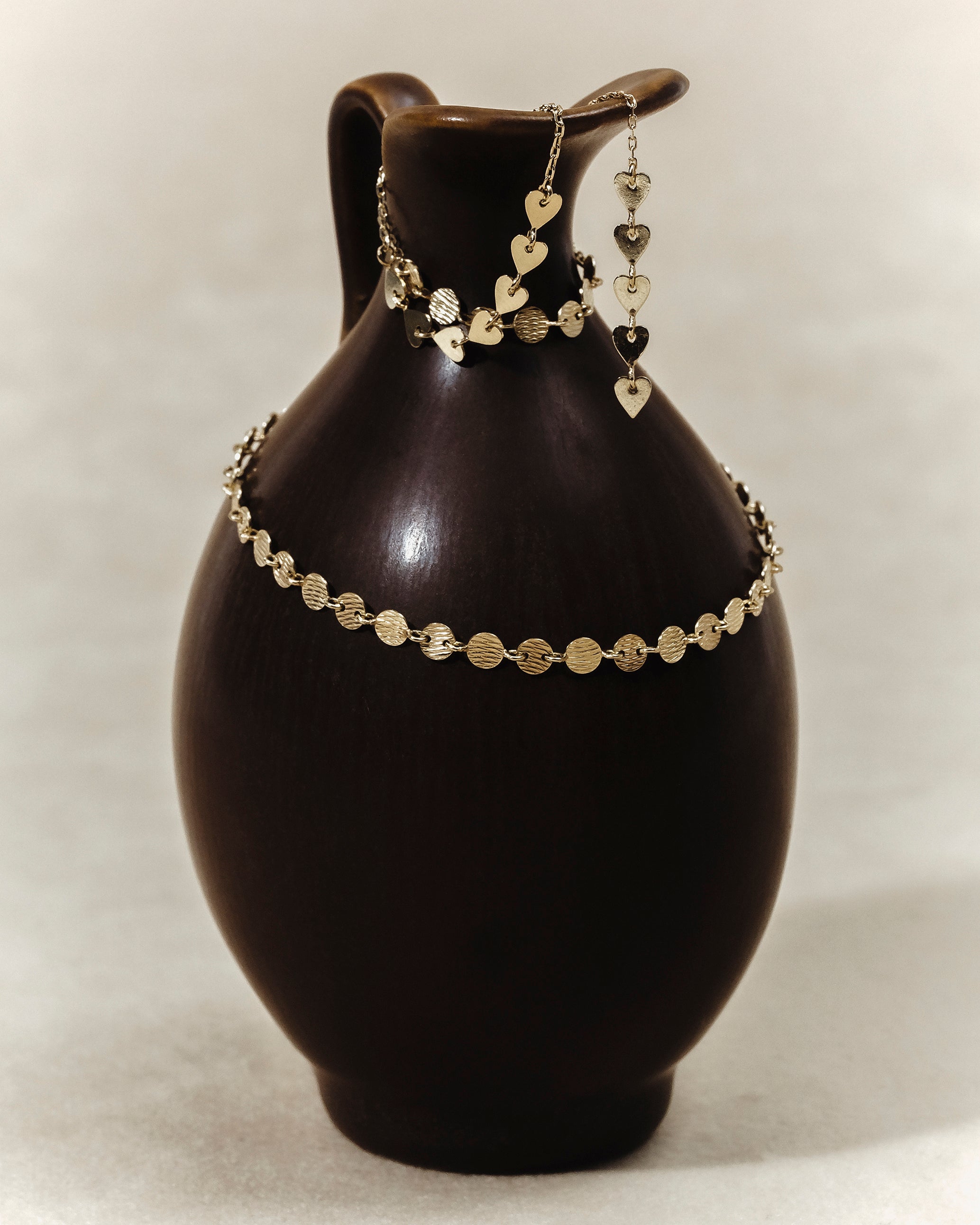 今回のコレクションは、ゴールドの薄いプレート状モチーフを連ねた繊細なデザインが特徴。スキンジュエリーのように軽やかに肌に馴染み、日常に取り入れやすいラインナップです。甘さを抑えた大人可愛いハートモチーフと、表面に波のような模様を施した落ち着いたきらめきのサークルモチーフを展開し、それぞれチェーンリング・ブレスレット・ピアスをご用意。