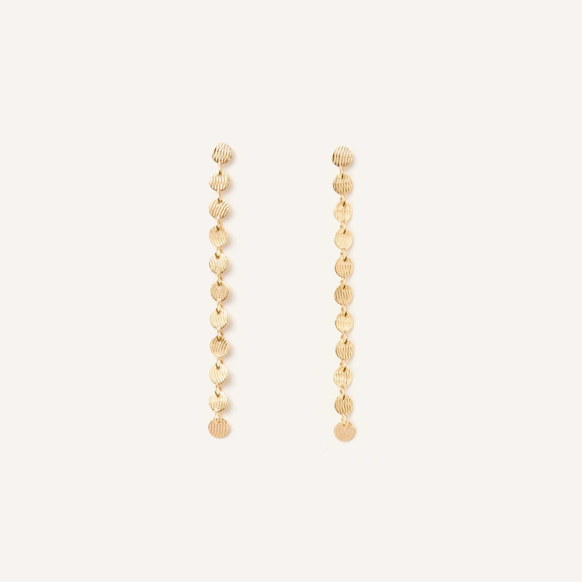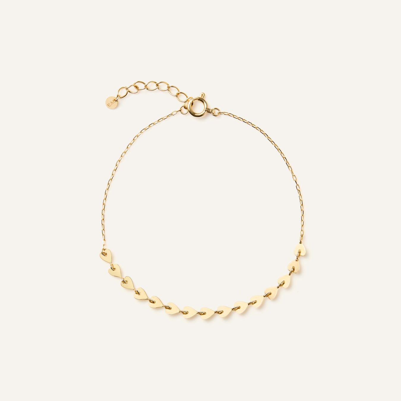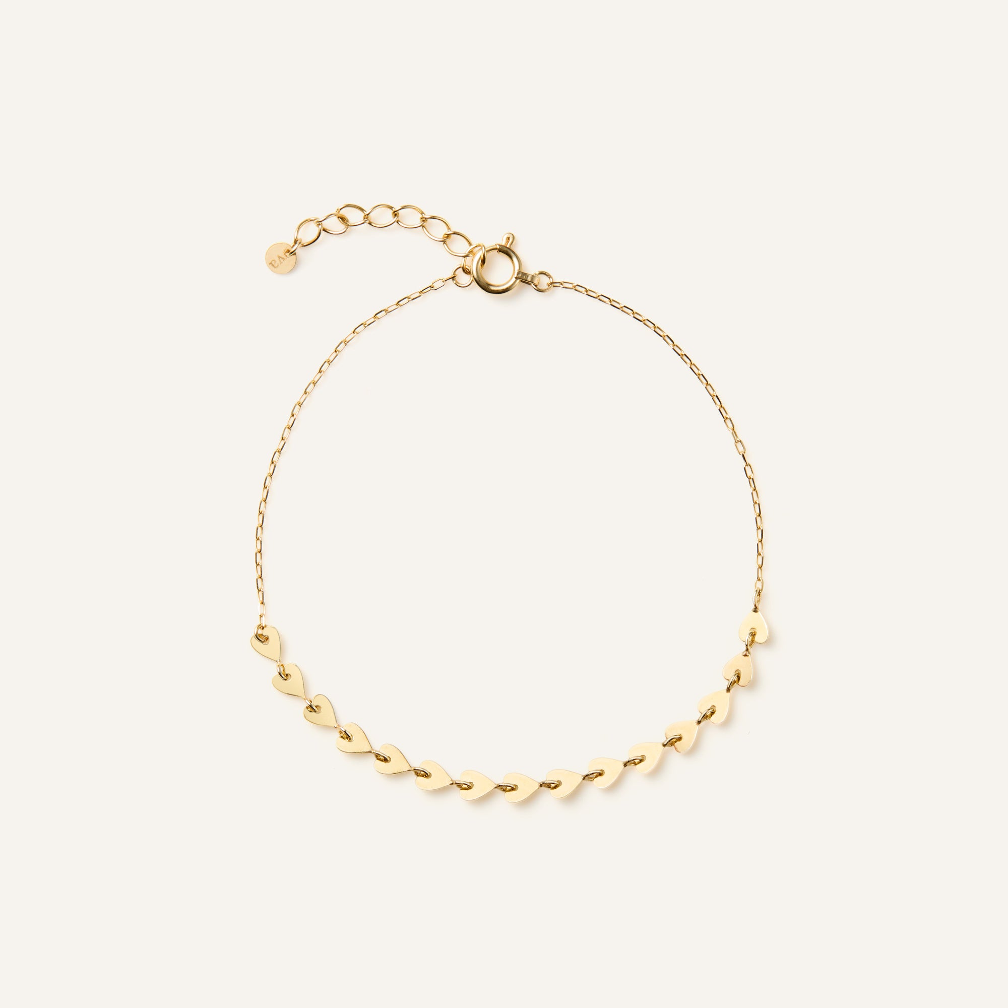 今回のコレクションは、ゴールドの薄いプレート状モチーフを連ねた繊細なデザインが特徴。スキンジュエリーのように軽やかに肌に馴染み、日常に取り入れやすいラインナップです。甘さを抑えた大人可愛いハートモチーフと、表面に波のような模様を施した落ち着いたきらめきのサークルモチーフを展開し、それぞれチェーンリング・ブレスレット・ピアスをご用意。