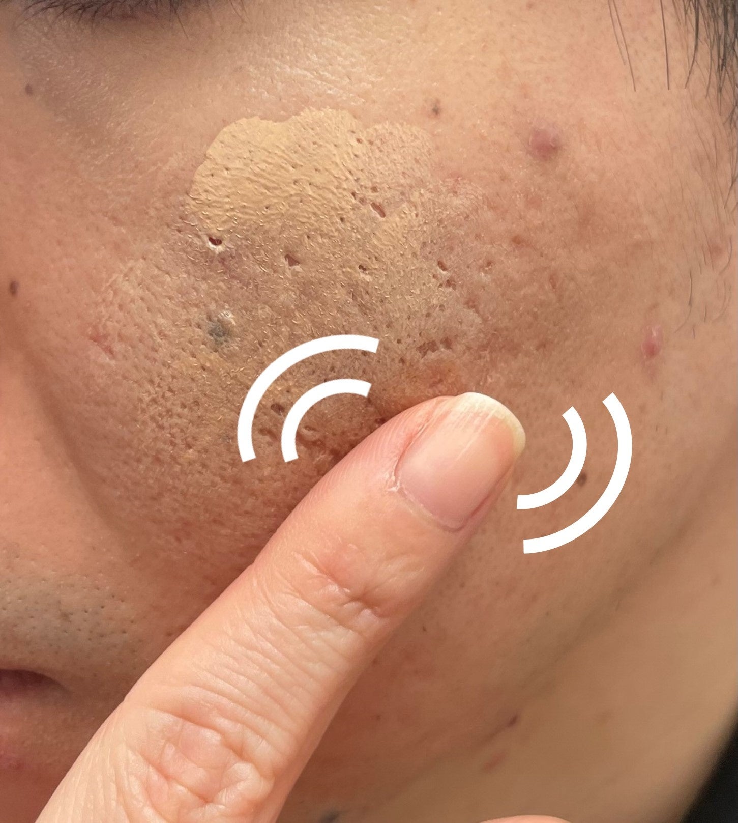 【ニキビ跡に悩む肌にメイクアイテム1品を使用する“1品1分メイクテクニック”の例】