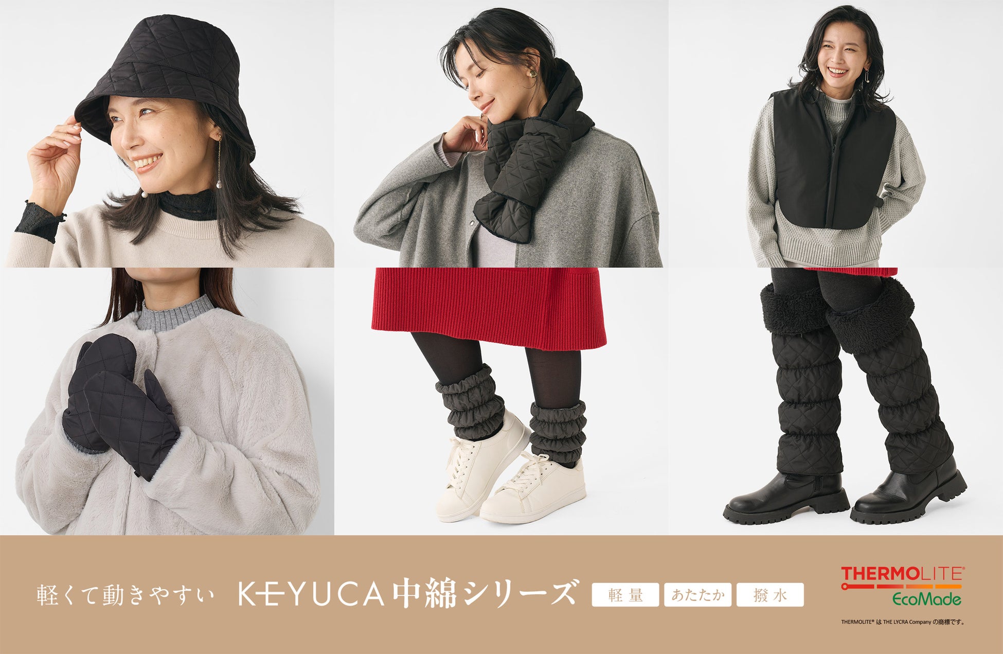 衣食住に関わるオリジナル商品を自社店舗で販売しているライフソリューションブランドKEYUCA(社名:河淳株式会社 所在地:東京都中央区、代表:河崎淳三郎)は、2025年10月4日(土)に中綿入り撥水機能の「キルトバケットハット」「ミニマフラー」「インナーベスト」「2WAYミトン手袋」「ギャザーレッグウォーマー ミニ」「ギャザーレッグウォーマー ロング」を発売いたしました。