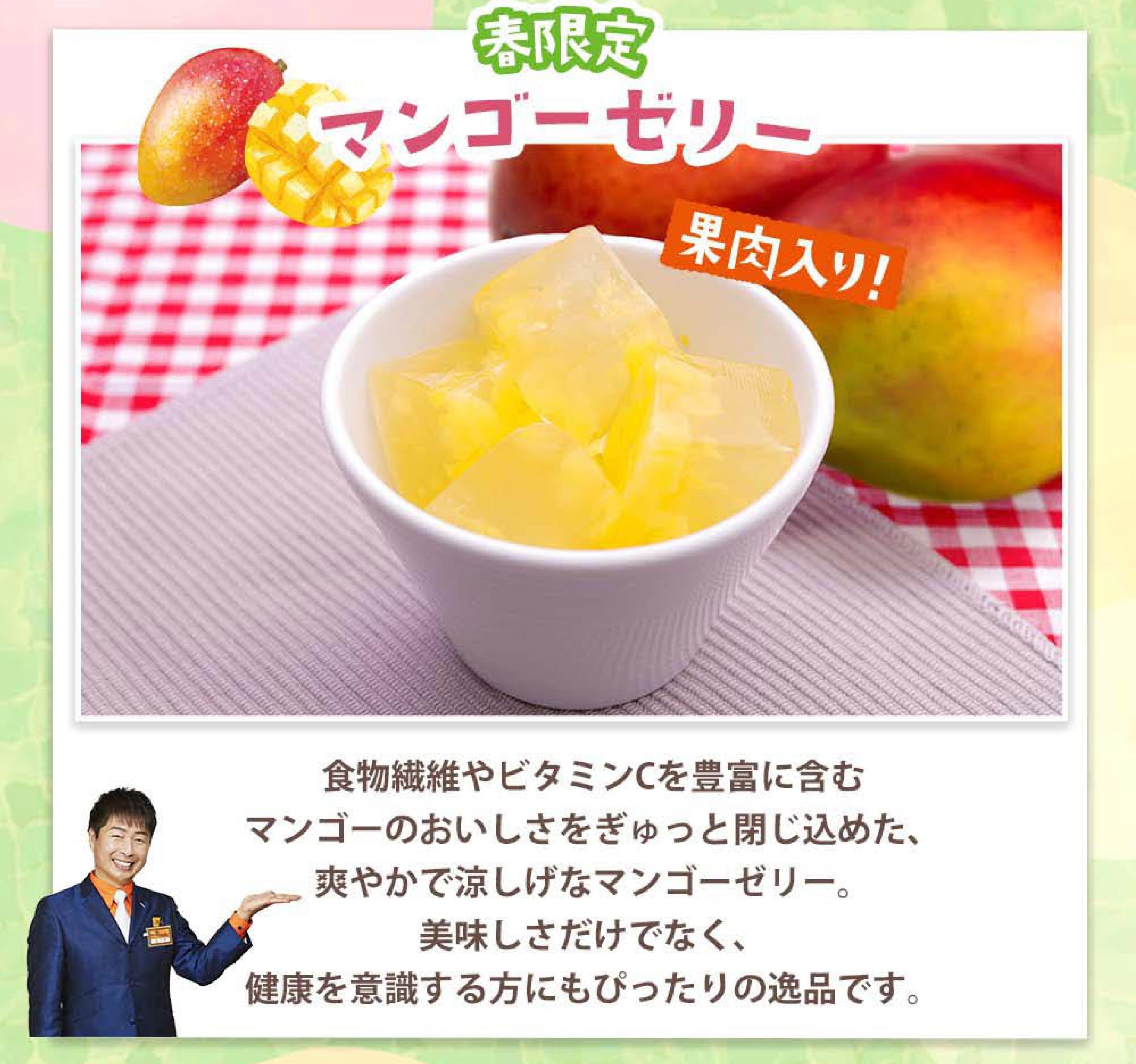 食物繊維やビタミンCを豊富に含むマンゴーのおいしさを“ぎゅっと”閉じ込めた、爽やかで涼しげなマンゴーゼリー。美味しさだけでなく、食後にもぴったりな逸品です。
