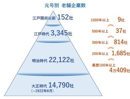 老舗企業の約4万社を元号別にみると、江戸時代が開府した1603年以前に創業した企業は152社となった。そのうち、日本最古の企業として有名な金剛組(578年創業、大阪府)を筆頭に「業歴1000年企業」は9社を数えた。次いで、250年以上続いた江戸時代に創業した企業は3,345社、約40年間の明治時代には22,122社、大正時代(業歴100年を迎える1922年8月まで)に創業した14,790社が存続している。