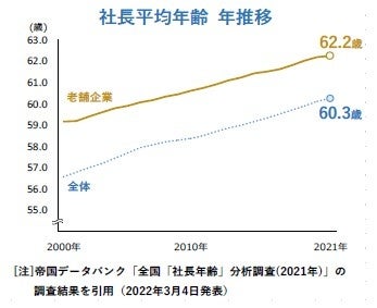 老舗企業の社長平均年齢は62.2歳、全体より1.9歳高い