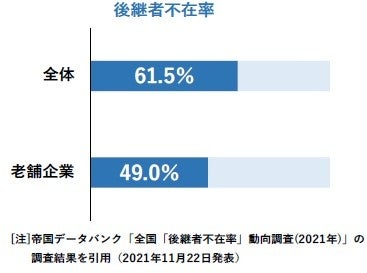 後継者の不在などが原因となり事業継続が断たれる「後継者難倒産」の件数は2021年に過去最多を更新するなど、日本の事業承継は厳しい局面に立たされている。2021年10月時点の後継者不在率は61.5%となり、減少傾向ながらも高水準が続いている。これに対して老舗企業では49.0%と半数を下回り、全体より12.5ポイント低い結果となった。