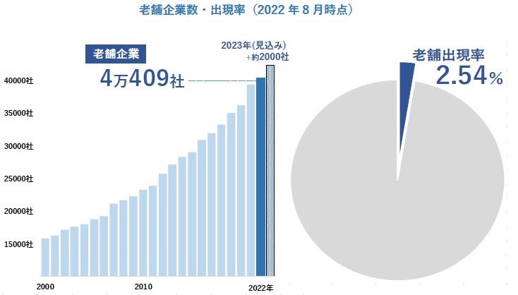 帝国データバンクが把握している、2022年8月時点で業歴100年を超える老舗企業 は、4万409社を数えた。毎年およそ1,000~2,000社が業歴100周年を迎えるなか、初めて4万社を突破した。2023年に100周年を迎える企業は約2,000社あり、さらなる増加が見込まれる。また、全体に占める老舗企業の出現率は2.54%だった。