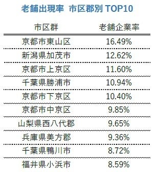 老舗出現率を市区郡別でみると、上位10地域のうち4地域が京都市内だった。加えて、千葉県勝浦市、その隣に位置する鴨川市、兵庫県美方郡は古くから港町として栄えており、水産系に関連した業種が多く並んでいる。また、新潟県加茂市は日本有数の桐箪笥の生産地で、木製家具製造業が目立つ。山梨県西八代郡では和紙製造など紙に関連する業種を中心に文具や事務用品関連も多いことが特徴。福井県小浜市は、奈良時代から京都に通ずる「鯖街道」「御食国」として栄え、交通の要所だった。それぞれ古くから根付いた文化を有していることが、高い老舗出現率の一因とも考えられる。