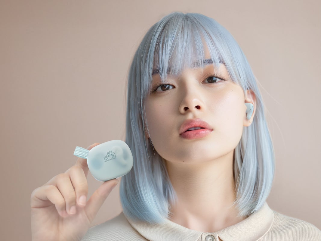 本機は、“シアーを着こなす”をコンセプトに、コンパクトで丸みのあるフォルムと、透け感のあるシアーなデザインを充電ケースに採用。さらにストラップ付きのため、カラビナやリングなどを使ってバッグの持ち手やベルトループなどに掛けられます。またイヤホン本体は、スフレマットな質感のカラーリングと、左右の識別がしやすい小型・軽量のスティック型ボディを採用し、デザイン性と使いやすさを追求しました。