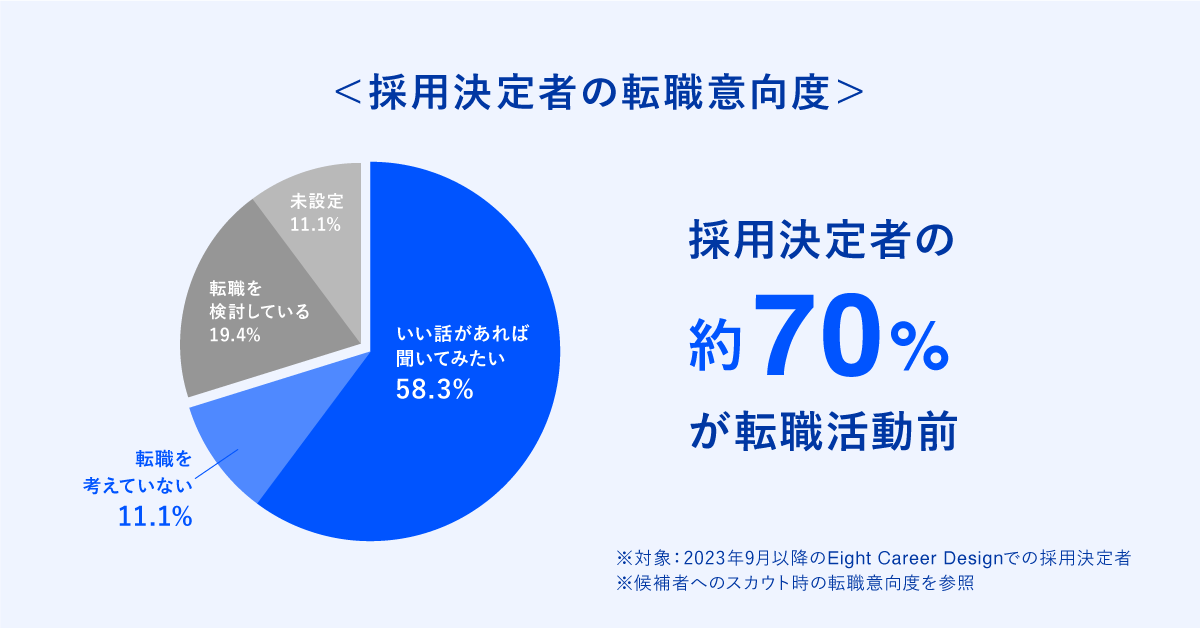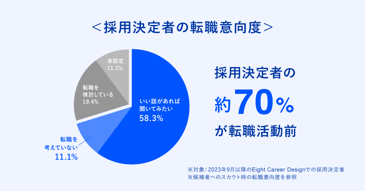 Eight Career Designではユーザーの転職意向度を参考にスカウトを送付することができます。直近半年間(2023年9月~2024年2月)の採用実績において、候補者へのスカウト時の転職意向度を参照したところ、約70%が転職活動前の潜在層であることが分かりました。