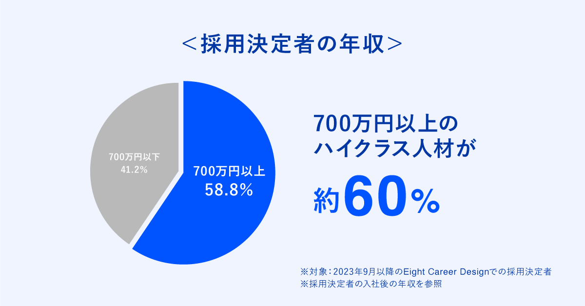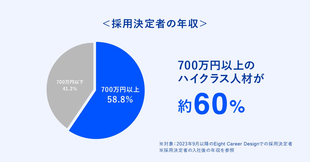 Eight Career Designでは2023年9月~2024年2月までの直近半年間の採用実績において、約60%が転職後の年収が700万円以上のハイクラス人材です。転職市場では出会えない市場価値の高いエンジニア職や営業マネジャー職、専門性の高いコーポレート職など幅広いポジションでの採用を実現しています。