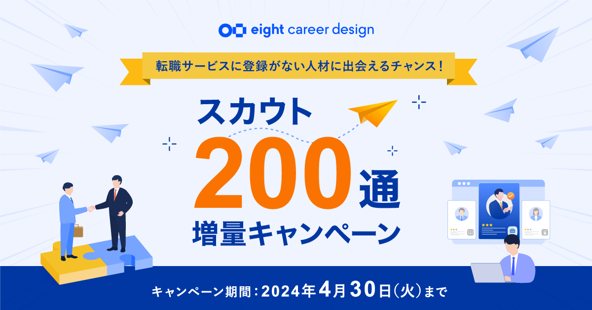 Eight Career Designでは導入社数累計1000社を突破したことを記念して、2024年3月27日(水)~4月30日(火)にキャンペーンを行います。キャンペーン期間中にEight Career Designを導入した企業を対象に、スカウト200通を無償で追加付与いたします。