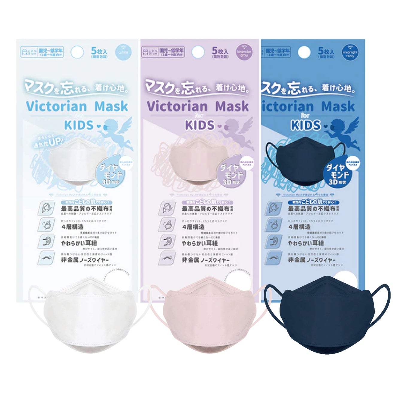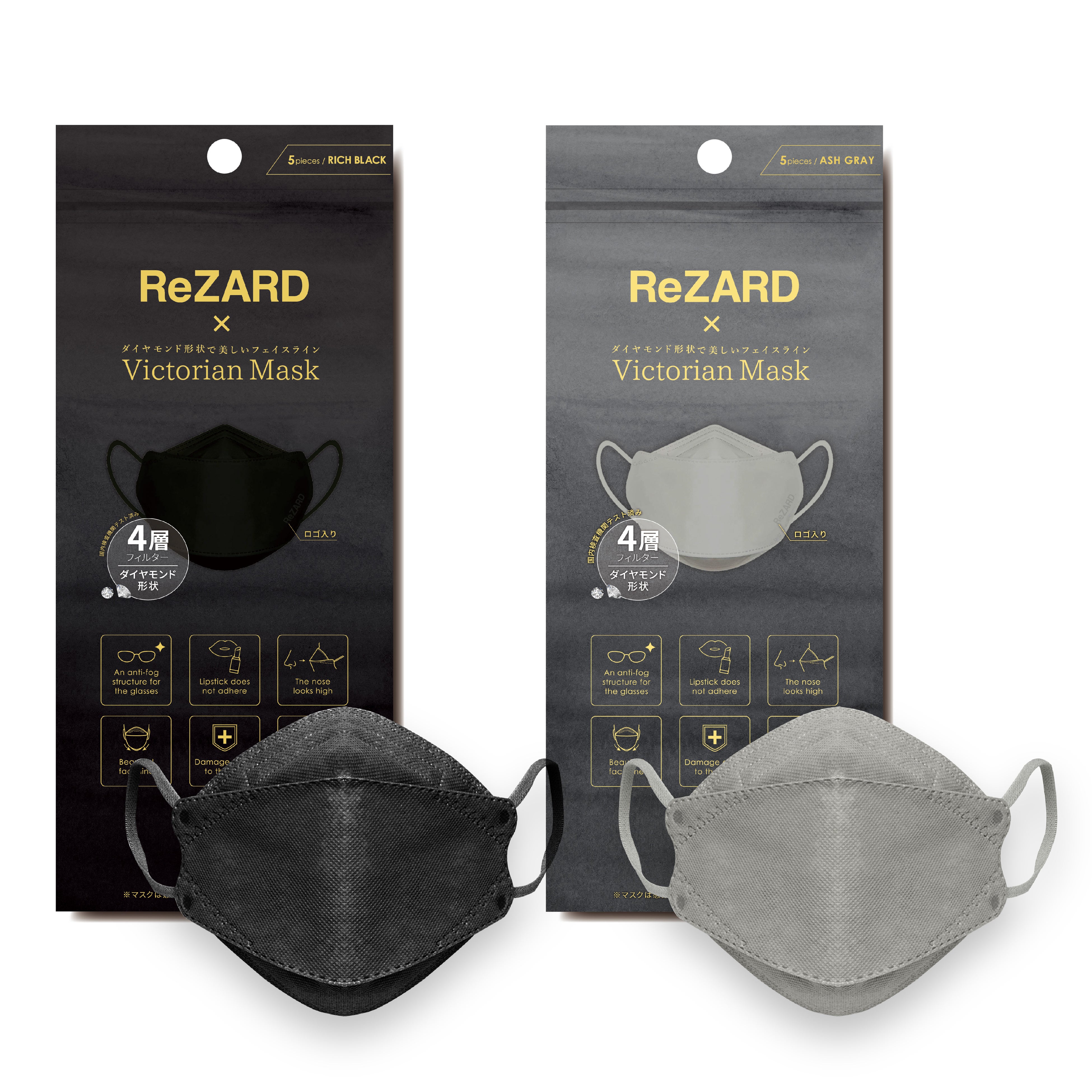 約0.1㎛(マイクロメートル)サイズの粒子を99.9%ろ過(捕集)できる、人体工学的な設計に基づいた新形状"ダイヤモンド形状"『Victorian Mask』は、マスク着用時のメガネの曇りや息苦しさ、口元のリップ付着などを解消いたします。