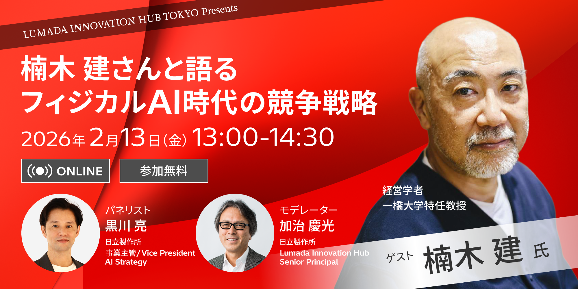 株式会社日立製作所(以下、日立)は、2月13日(金)にウェビナー「楠木建さんと語る、フィジカルAI時代の競争戦略」を開催します。生成AIの導入が一巡し、多くの企業が「最新技術を導入しても、他社との明確な差がつかない」という課題に直面する中、本ウェビナーではAI時代における「持続的な競争優位」の築き方を深掘りします。