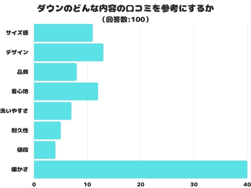 ダウンのどんな内容の口コミを参考にするかをアンケートにて調査したところ、1位は「暖かさ」でした。