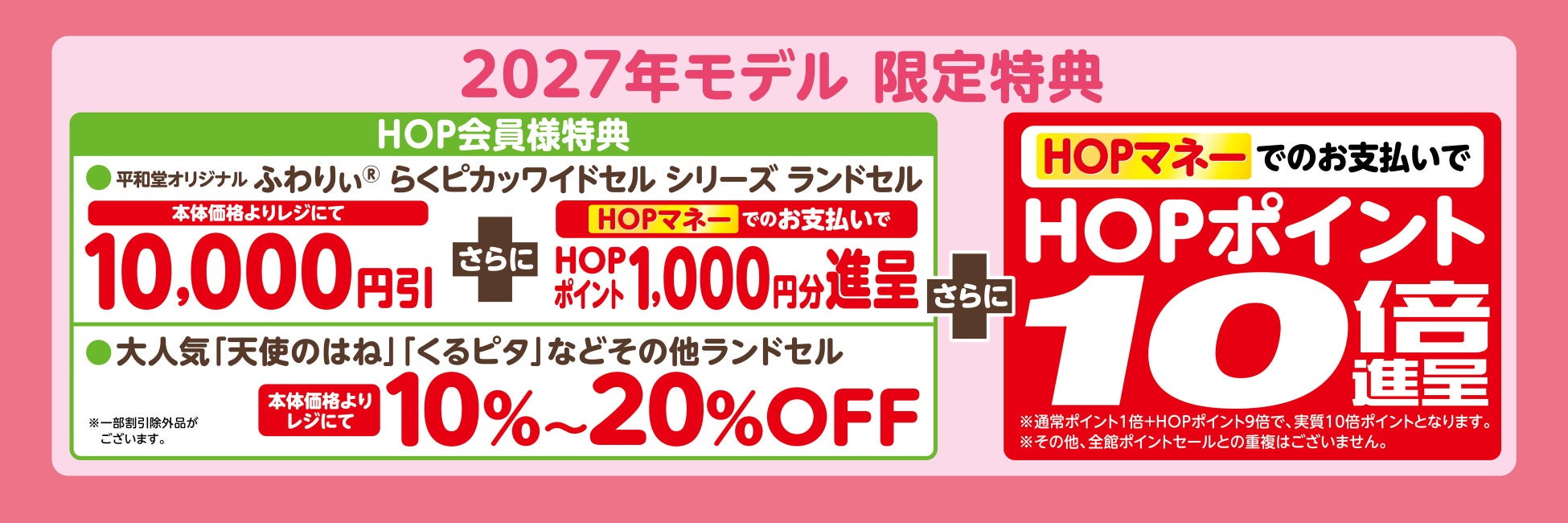 さらに平和堂オリジナルランドセル「ふわりぃ らくピカッ ワイドセル」ご購入で、1,000HOPポイント進呈