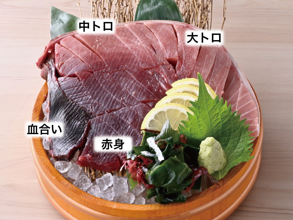 天然ミナミまぐろの赤身やトロの部分を贅沢に堪能できる一品。血合いの部分は焼いて食べるのがおすすめです。