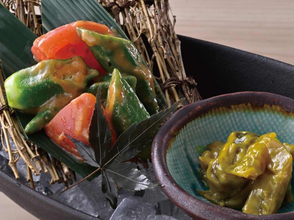 ■茄子のからし漬けとオクラとトマトの七味みそ和え 398円(税込438円)