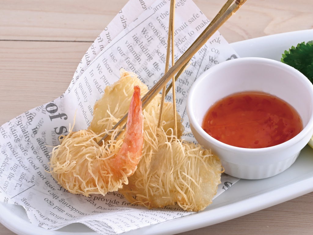 カダイフとはトルコなどで食べられる「天使の髪」と呼ばれる細い麺状の生地のことで、串揚げの衣に使用することでパリッとした食感をお楽しみいただけます。