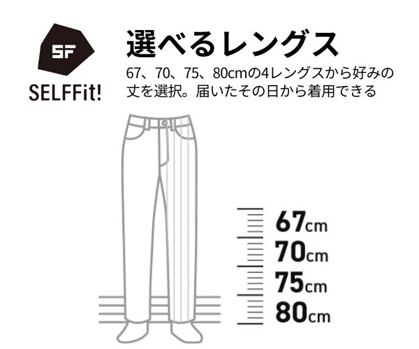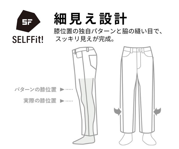 「もう少し足が長く見えたらいいのに」「もっとすっきり見えたらいいのに」といったご要望に応えるために、体型を徹底研究しオリジナルのサイズ設計ブランド『SELFFit!(セルフフィット)』が誕生。