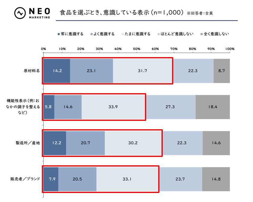 特に「原材料名」は、“食の安全”という文脈にかかわらず、健康やダイエットの観点からも注目されやすいからか、「常に意識する」「よく意識する」の回答のみで37.3%もの票が集まっています。