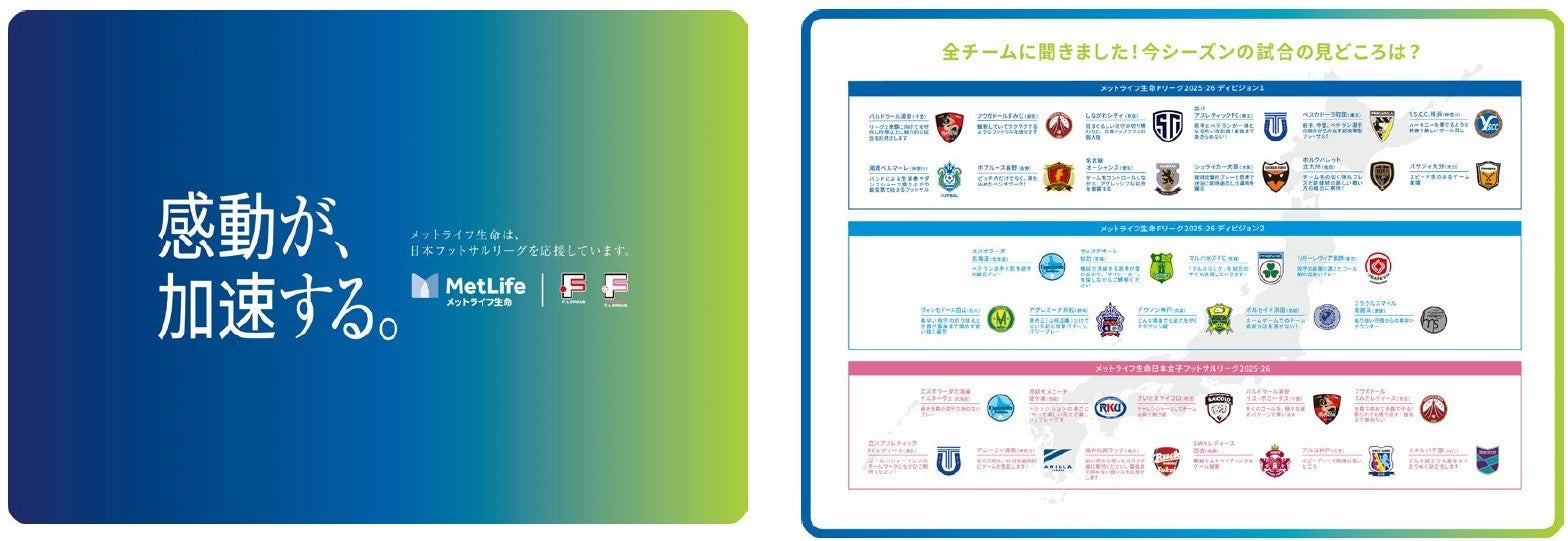 5月31日より開幕する「メットライフ生命F1リーグ2025-26」、「メットライフ生命F2リーグ2025-26」、「メットライフ生命女子Fリーグ2025-26」(以下、メットライフ生命Fリーグ)を応援するメインビジュアルおよびスペシャルムービーを公開しました。