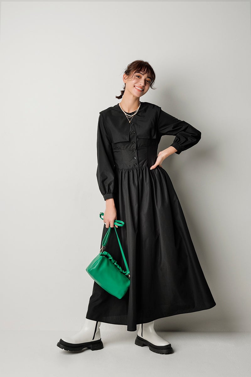 今春のトレンド小物、ギャザーデザインのミニバッグもコラボ! チャーミングなミニサイズながらも、スマホや財布などはしっかり収納できるサイズとフォルムを追求。持ち方次第で多彩な表情になるのもこのバッグの面白いところ! リサイクルポリエステルによるサスティナブルなエコレザーづかいも今っぽい。