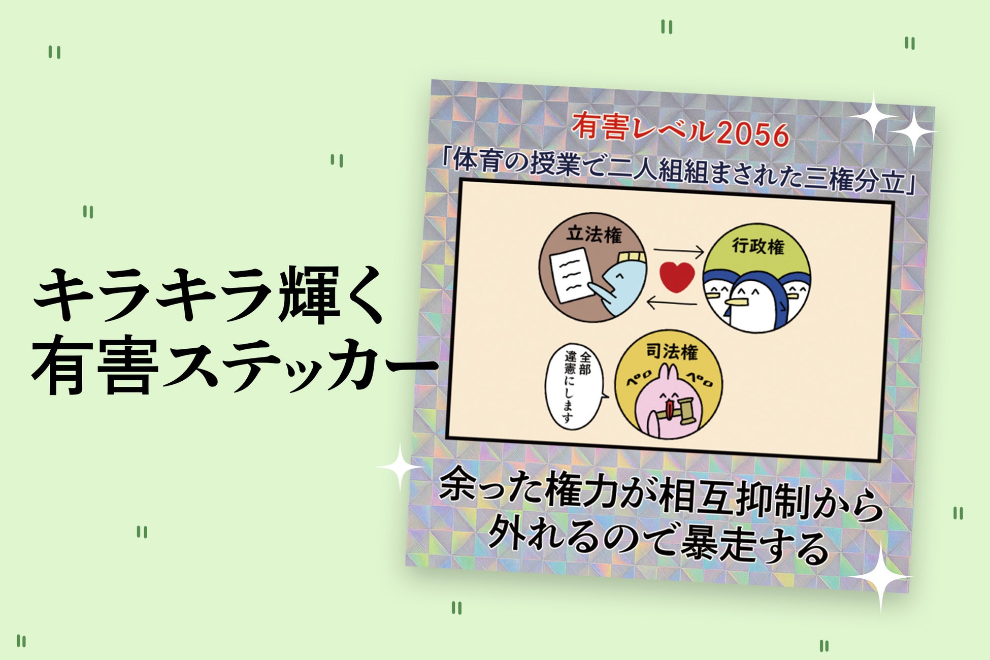 普段ニョペ茄子のグッズとして販売される有害ステッカーとは異なり、キラキラ輝く超レア仕様となっております。「三権分立孤立マカロン」やグッズと一緒に撮影すれば、『魚の4コマ』の世界を一気に作り出すことができるこのアイテム。