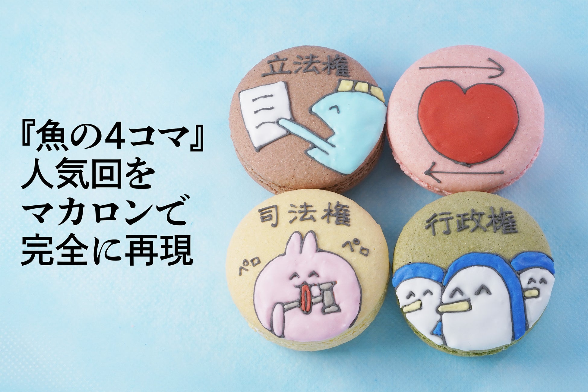 繊細な細ペンの装飾(アイシング)で、『魚の4コマ』のキャラクターを完全再現。1マカロンに1キャラクターを描いているので、ゲームのコマのように動かして、色々な組み合わせを楽しめるようになっています。
