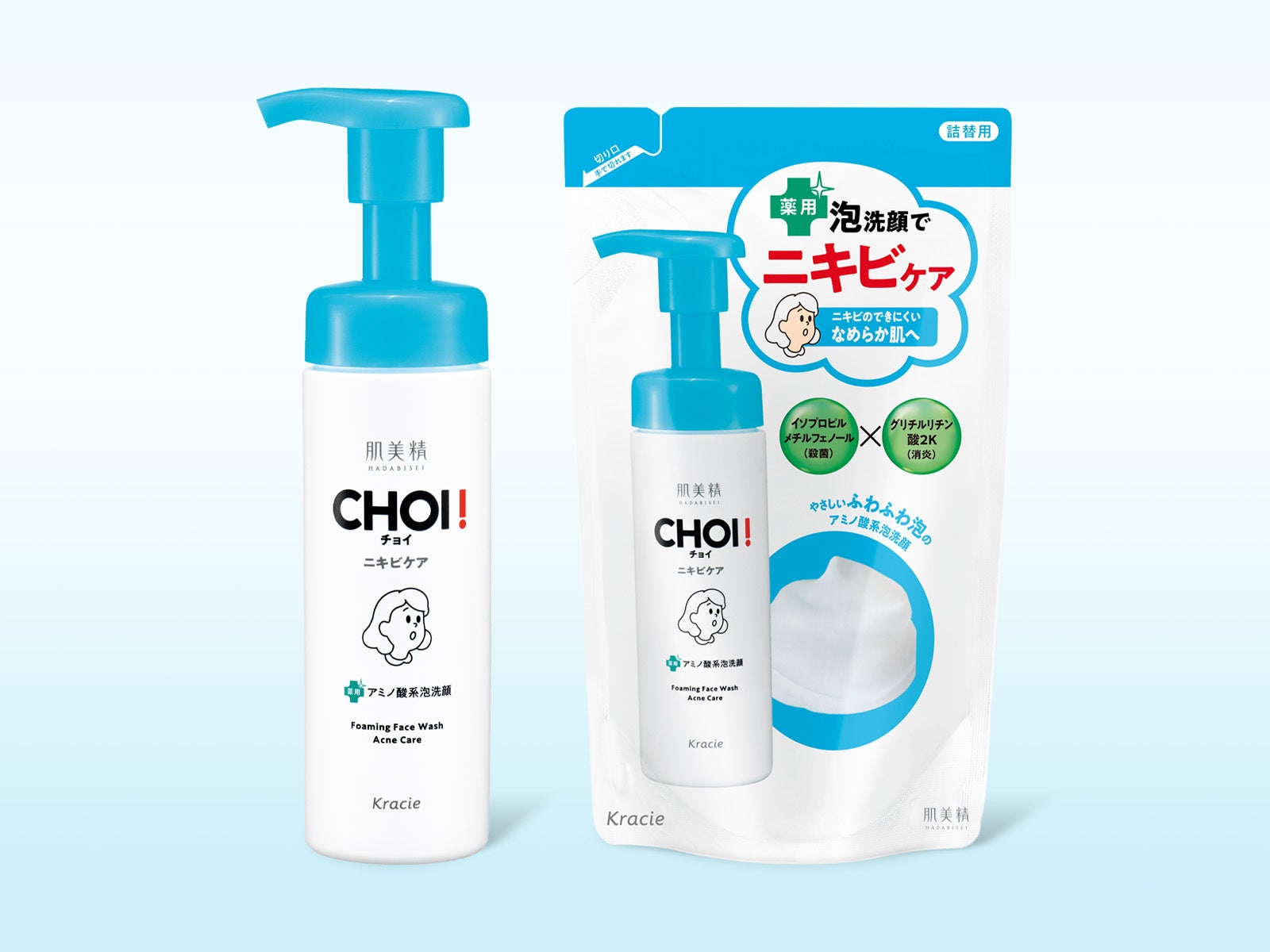 「肌美精 CHOI薬用泡洗顔」は、アミノ酸系洗浄成分配合のやさしい泡で、ニキビや毛穴悩みのある肌をケアしながらしっかり汚れを落とすことができる薬用処方の洗顔アイテムとして、今年の3月に新発売しました。忙しい朝は泡立てずに素早く顔を洗うことができる「泡洗顔」の使い勝手が良い、というお客様の声に応え、たっぷり使える「詰替用」を追加し、朝洗顔ケアの習慣化をサポートしていきます。