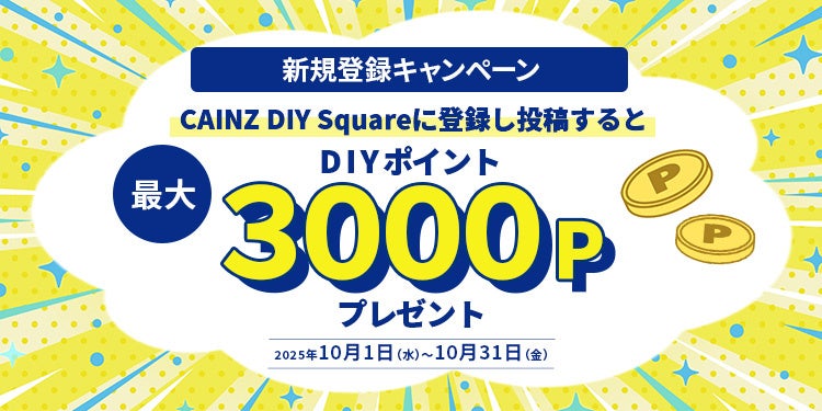 株式会社カインズ(本部:埼玉県本庄市、代表取締役社長 CEO:高家 正行)は、DIY好きがつながるオンラインコミュニティ「CAINZ DIY Square(カインズ ディーアイワイ スクエア)」を、10月1日(水)にリニューアルしたことをお知らせします。これを記念して、期間中に新規会員登録と投稿をしていただいた方を対象に、オンラインコミュニティ内でのランクアップに有効な「DIYポイント」を最大3,000Pプレゼントするキャンペーンを10月31日(金)まで開催します。