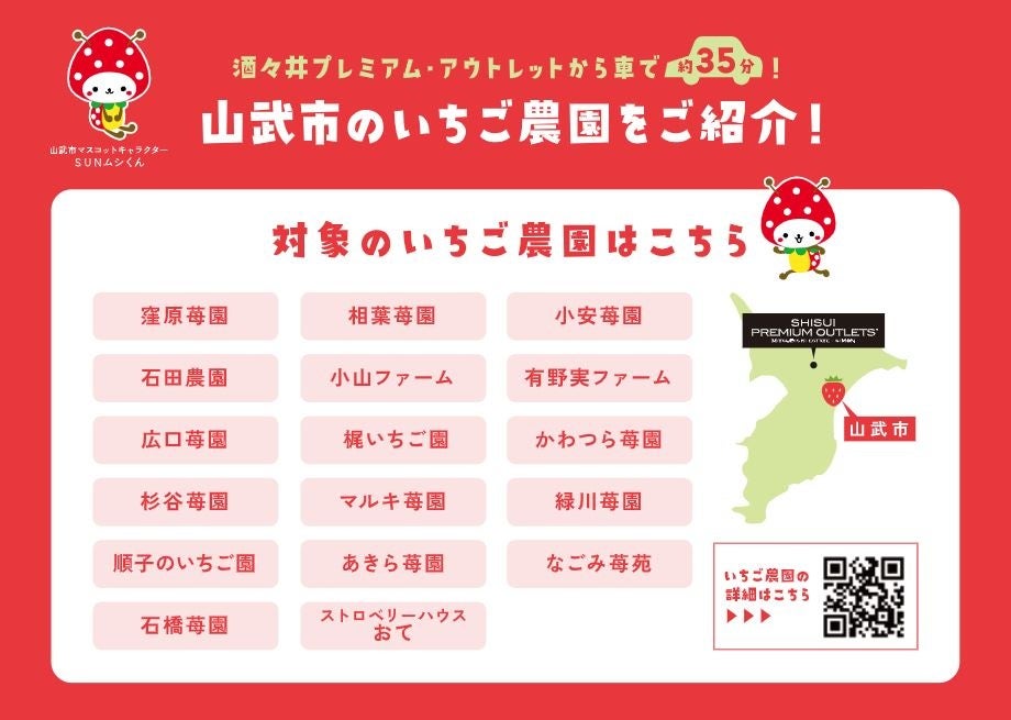 対象施設:相葉苺園、あきらいちご園、石田農園、石橋苺園、和苺苑、梶いちご園、かわつら苺園、窪原苺園、小安苺園、小山ファーム、順子の苺園、ストロベリーハウスおて、杉谷苺園、広口苺園、マルキ苺園、緑川苺園、有野実ファーム(全17施設)