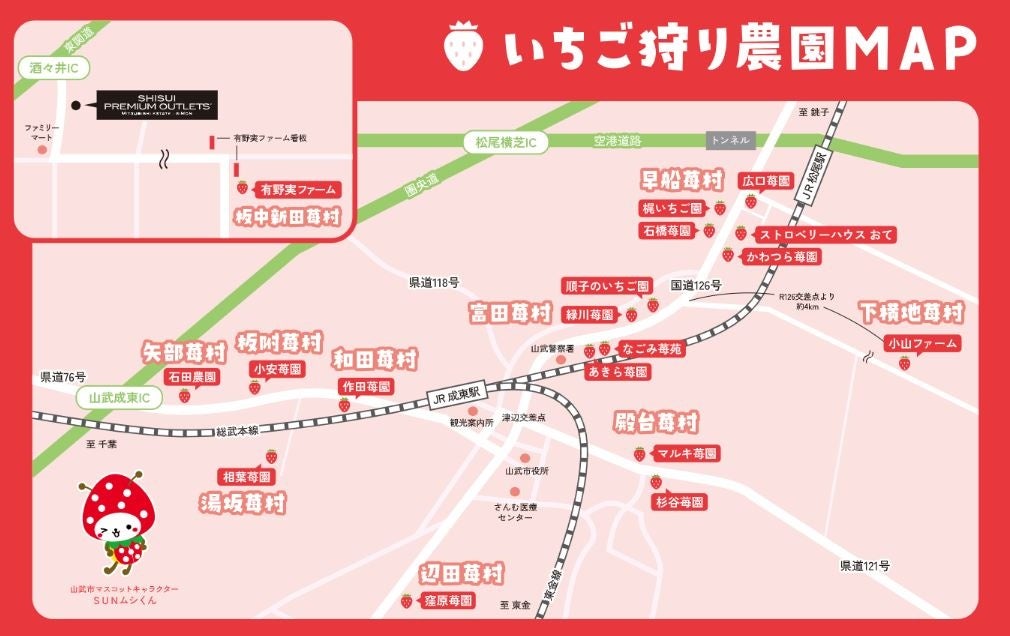 酒々井プレミアム・アウトレットから九十九里浜方面へ車で約35分の山武市成東エリアは、関東最大級のいちご狩りスポットとして知られています。JR成東駅近くの国道126号線は「ストロベリーロード」という異名を持つほど、いちご狩り施設が多数点在しています。