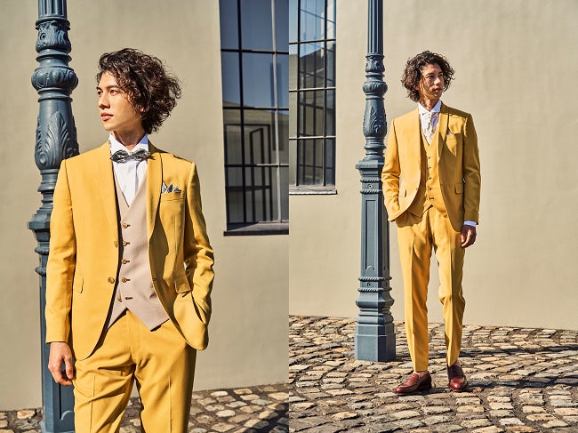 また、新作タキシードは2デザインが登場します。「Resoll Noir CASSIA(カシア)」は、リゾートの色鮮やかな景色に映えるマスタードイエローカラーのタキシードです。イエローとベージュのリバーシブルベストと、ペイズリー柄のナロータイで、遊び心あるコーディネートが楽しめます。「Resoll Noir NAIA(ナイア)」は、ノーカラー仕様でファッション性を重視したネイビーカラーのタキシードです。ベストはUネックで、パンツは2タックで丸みのあるカジュアルなフォルムに仕上げており、曲線的で柔らかい雰囲気を演出します。バイオレット×ペイズリー柄のタイが差し色となり、ワンランク上のおしゃれが叶います。