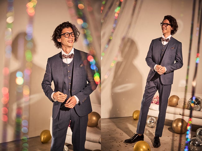 ノーカラージャケットやUネックのベスト等、ファッション性を重視した、曲線的で柔らかい雰囲気のタキシードです。青みの強い明るめのネイビーカラーに個性あふれるベストを合わせ、さわやかに着こなせます。パンツは、2タック仕様で丸みのあるリゾートシーンにぴったりのカジュアルなフォルムです。ペイズリー柄とバイオレットカラーのタイが、ネイビーカラーのアクセントになり、遊び心あるおしゃれが叶います。