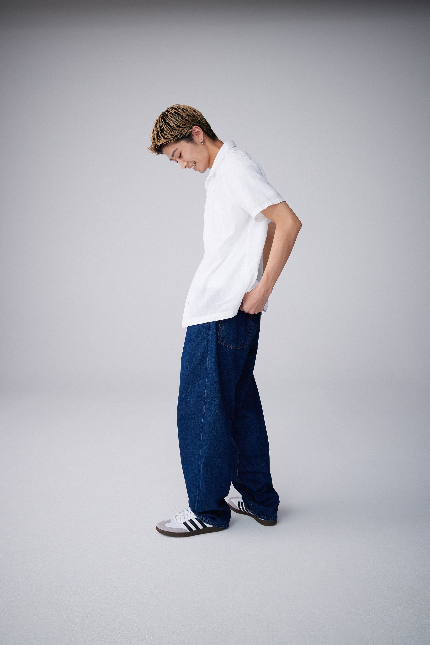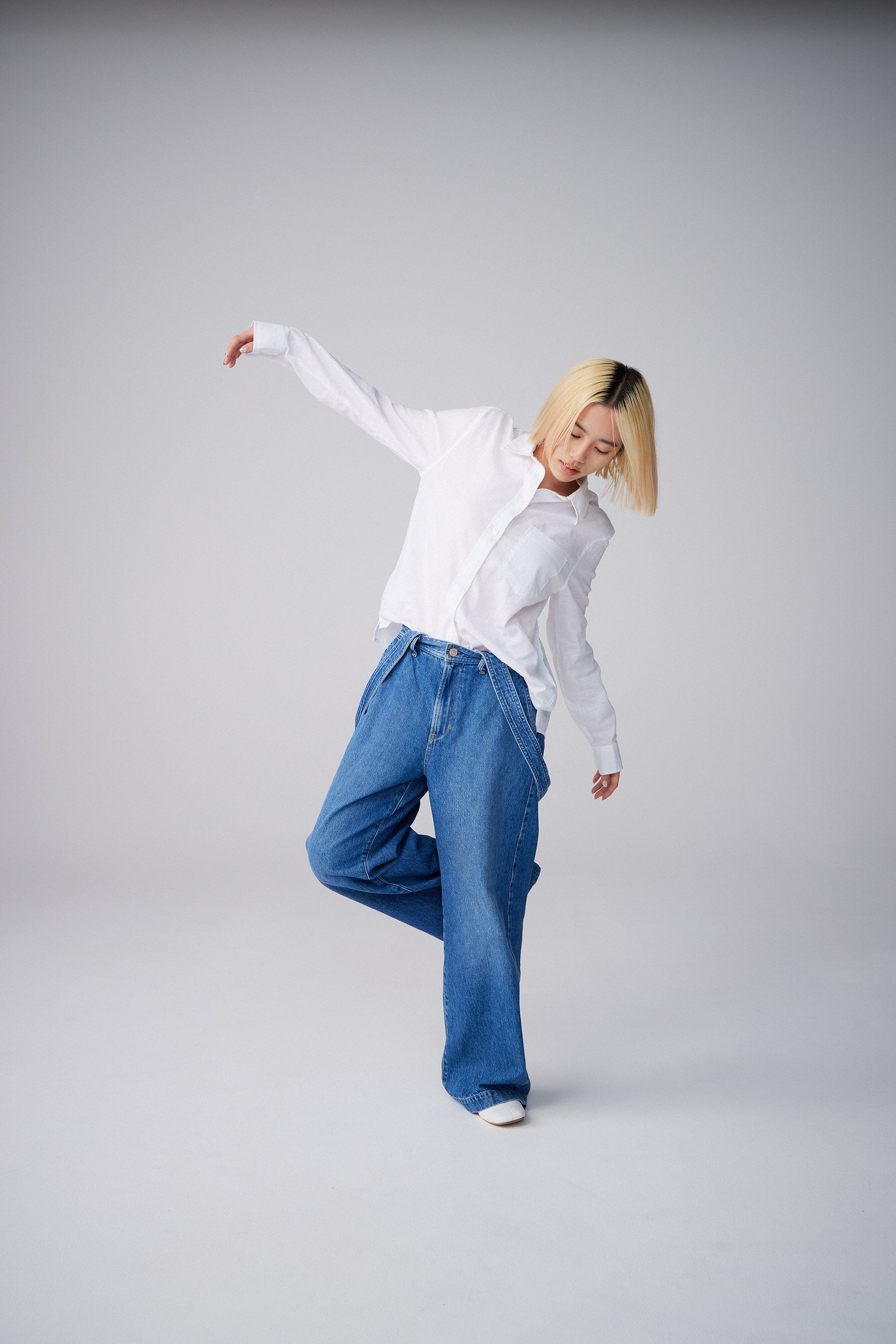 着用アイテムは、オーバーサイズのオックスフォードシャツや、胸元のGAPロゴがポイントのポップオーバーシャツ、清涼感のあるリネンシャツ、ベルト付きのビッグシャツなど、ベーシックなデザインながらもモダンにアップデートされたホワイトシャツがラインナップ。デニムは、リラックス感あるストレートの’90s Loose、ゆったりとしたシルエットが魅力のバギー、サスペンダー付きになったワイド、パッチポケット付きがアクセントのフレア、脚が綺麗に見えスタイルアップが叶うクラシックストレートなど、豊富なシルエットが並びます。