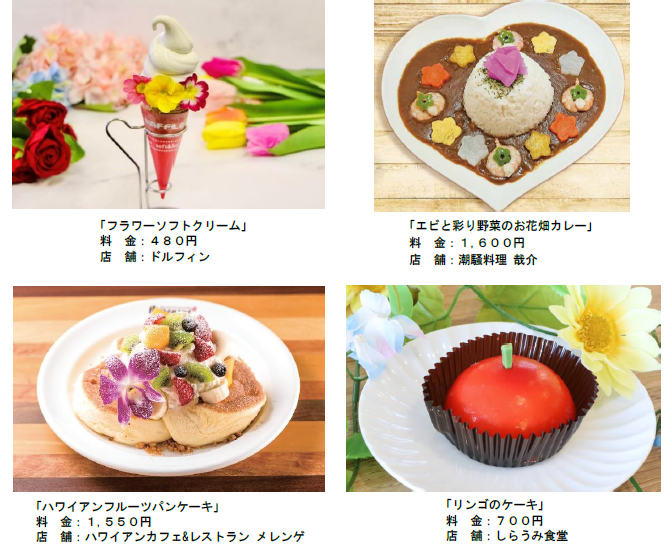 島内のレストランや軽飲食店舗では、花のフードメニューをご用意いたします。食用花であるエディブルフラワーを使用した「フラワーソフトクリーム」や、お花畑を表現した「エビと彩り野菜のお花畑カレー」など、味覚だけでなく視覚でもお楽しみいただけます。