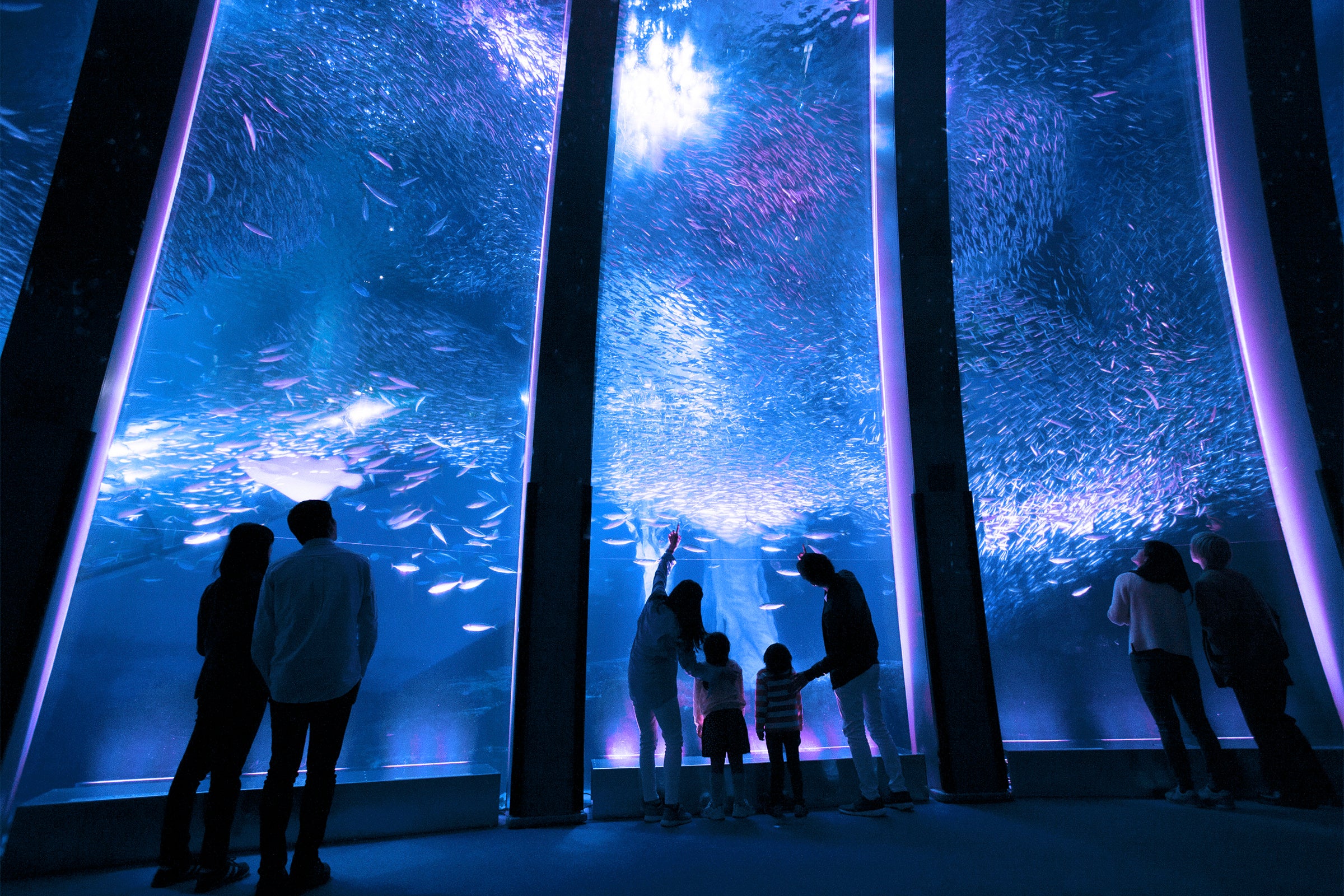 水族館「アクアミュージアム」にある高さ8m、水量1,500トンの大水槽「大海原に生きる群れと輝きの魚たち」では、国内最多飼育数5万尾のイワシが音楽や照明に合わせ乱舞する「スーパーイワシイリュージョン」を毎日開催しております。期間中の「スーパーイワシイリュージョン」では、大水槽全体が梅雨やあじさいなどをイメージした 青色などの淡いライティングとなり、降りそそぐ雨のようにイワシがキラキラと輝くパフォーマンスをお楽しみいただけます。