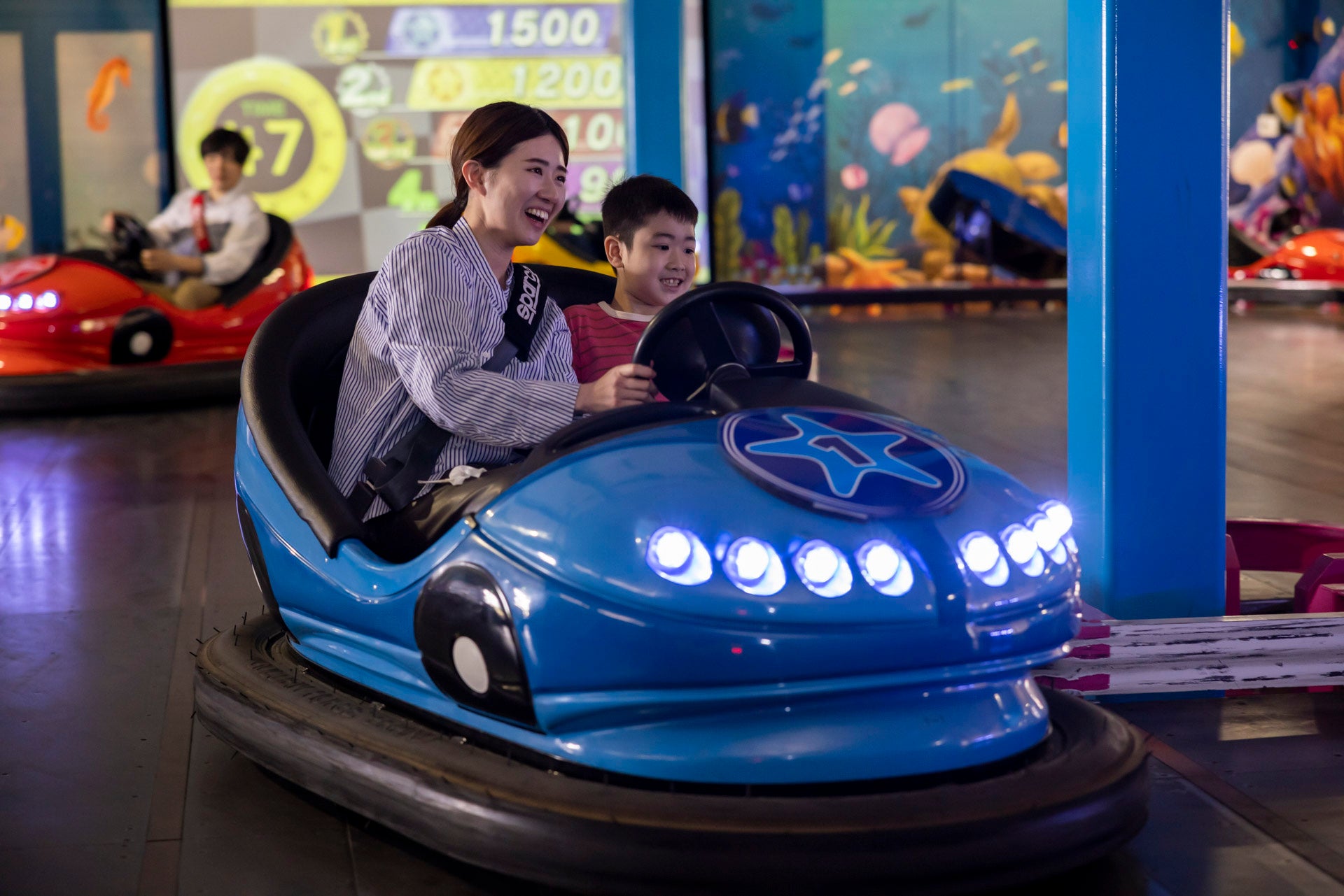 2人乗りのカートに乗って、走行エリアに投影されるスターフィッシュを通過することで入手する得点を競う、海底が舞台の全天候型カートアトラクションです。ハンドルを操作し、自分が乗っているカートと同じ色のスターフィッシュを通過すると得点アップ!おひとりでも、お友達ともお楽しみいただけます。