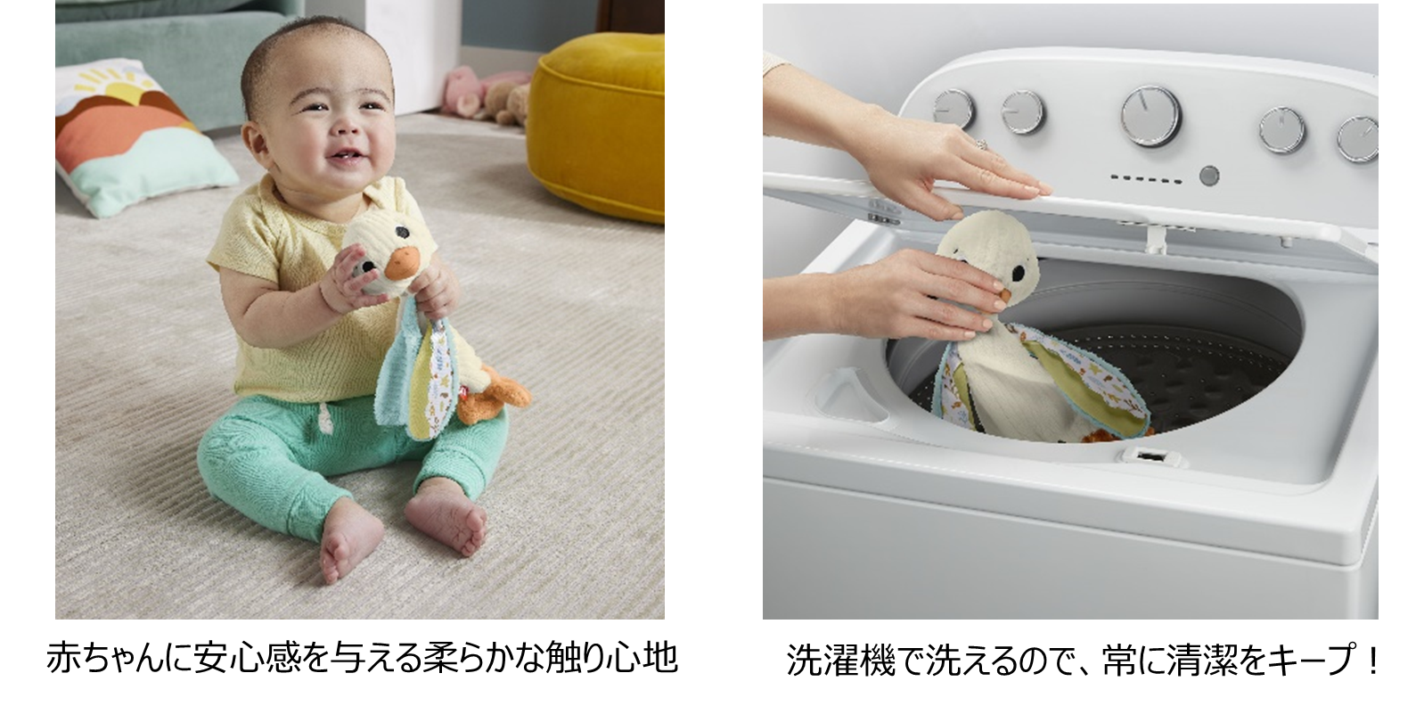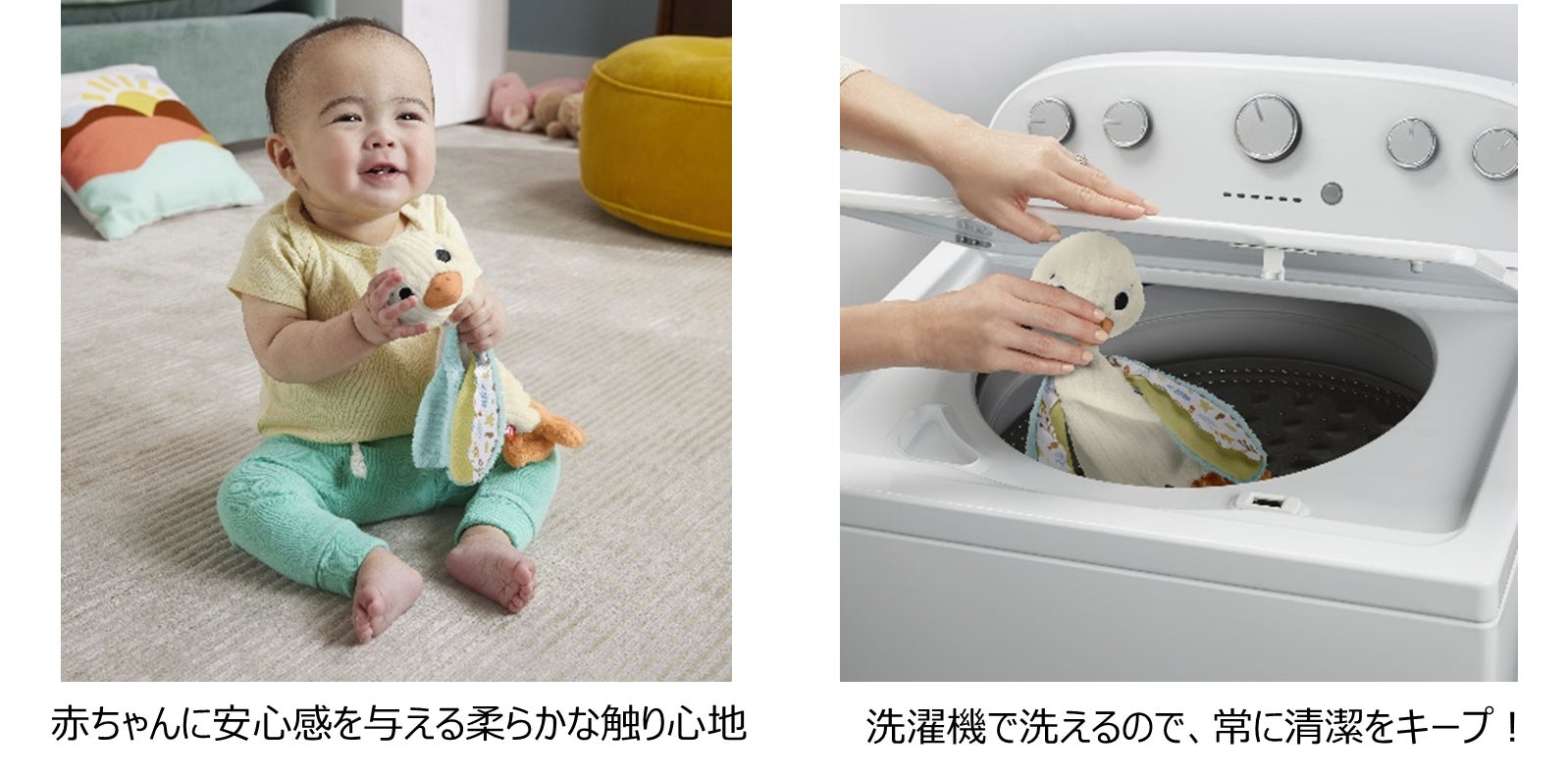 【Point】 ✓ 90年以上の歴史をもつベビー・プリスクール向け玩具グローバル売上No.1*ブランド 「フィッシャープライス」からはじめてのおもちゃに最適なぬいぐるみと、 1才のお誕生日プレゼントにもピッタリのわんわんのニコニコラーニングから新商品が登場! *The NPD Group/2022/USD ✓ 「ふわくたアヒルのぬいぐるみ」は、ぎゅっと抱きしめるたびに赤ちゃんに安心感を与えてくれる 心地よい触り心地が特長。さらに、洗濯機で洗うことができるので、常に清潔をキープ! ✓ 「すわってたのしい!わんわんのバイリンガルチェア」は、しかけいっぱいのお子さま専用の 魔法のチェア。 120以上の歌とおしゃべりで、成長にあわせて色やかたち、数、反対語など日本語と英語で学べる! |