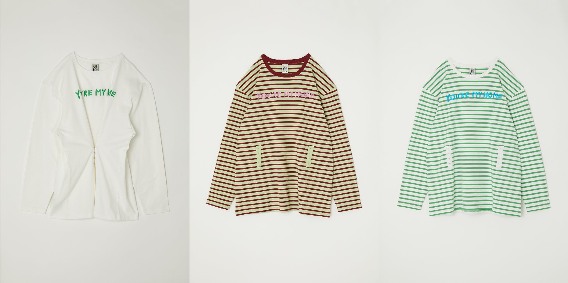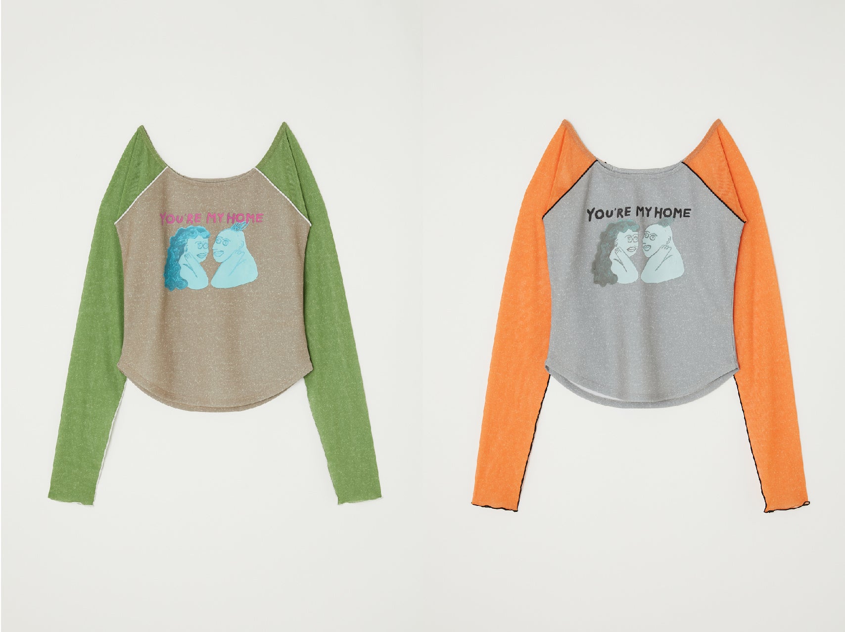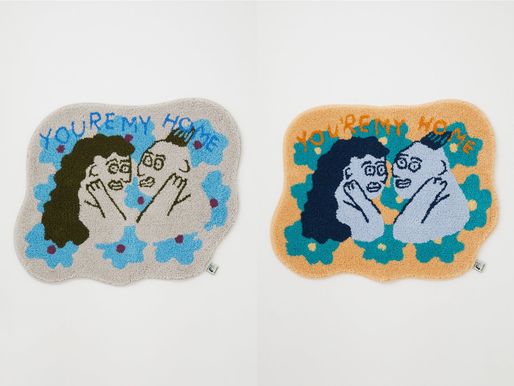 独自のタッチで描かれた、ついクスッと笑ってしまう可愛らしい絵が落とし込まれたアパレル2型、ラグマットとクッションカバーの全4型がラインナップ。