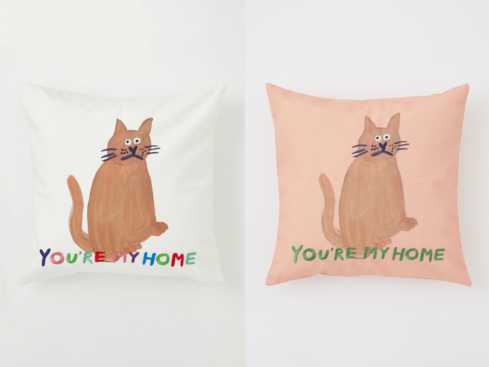 刺繍、プリント2つの手法でクッションカバーに落とし込まれた猫のアートワークはコミカルでありながらチャーミングなリミテッドアイテム。