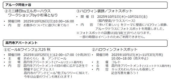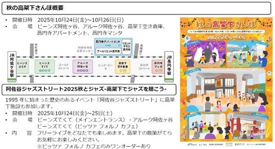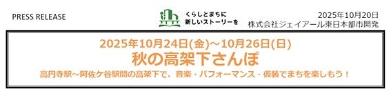 ジェイアール東日本都市開発では、阿佐ヶ谷・高円寺エリアの方に「歩きたくなる高架下」と感じていただけることを目指し、「阿佐ヶ⾕・高円寺プロジェクト」という活動を続けています。このたび、2025年10月24日(金) ~10月26日(日)に「秋の高架下さんぽ」と題しまして、期間中さまざまなイベントを高円寺駅~阿佐ケ谷駅間の各施設において開催いたします。