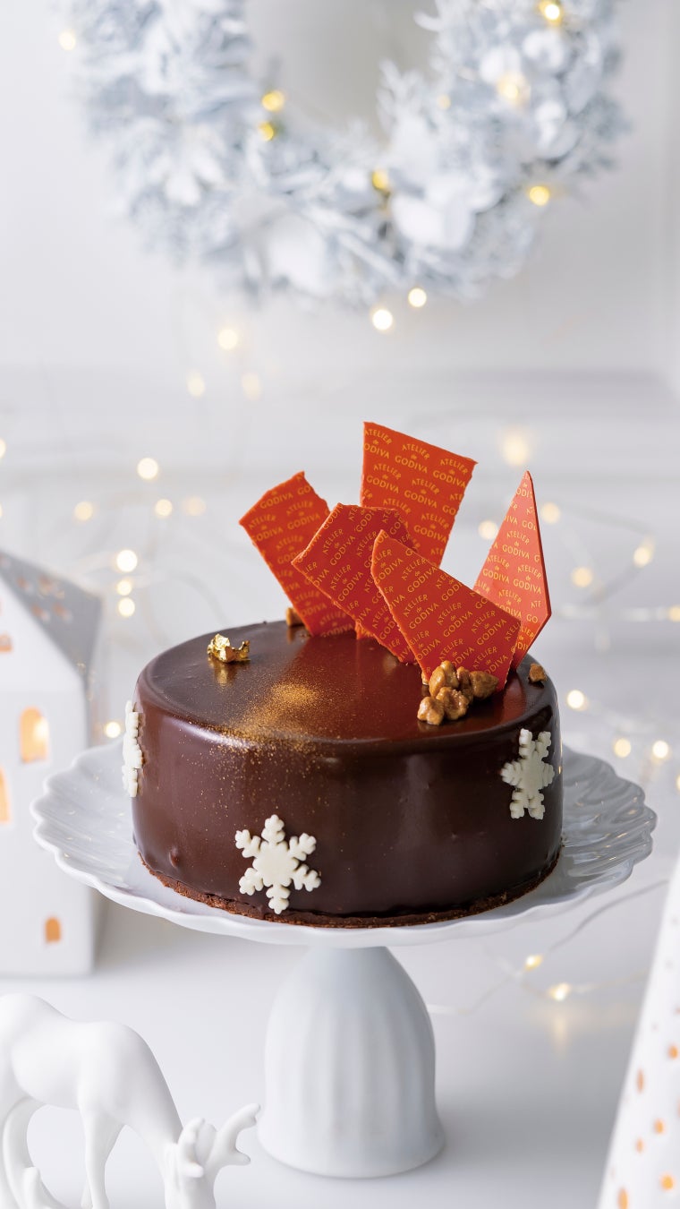 塩バターキャラメルのような香ばしい風味が特徴的な、キャラメルホワイトチョコレートのムースが主役のクリスマスケーキです。グラサージュはカカオ分55%のダークチョコレートで、リッチなチョコレートの味わいをお楽しみください。きらりと輝くゴールドのデコレーションがクリスマスのお祝いムードを盛り上げます。